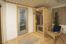 Вместительная инфракрасная комнатная сауна в классическом стиле. Стеклокерамические нагреватели.
